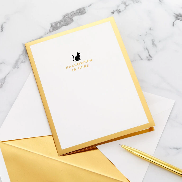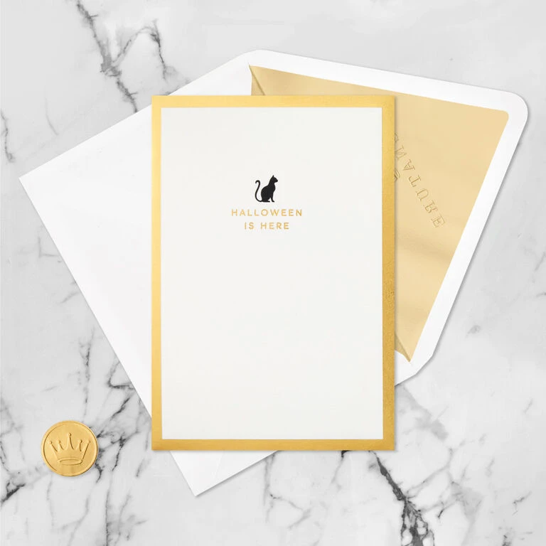 Pop-up Halloween greeting card features a “Halloween Is Here” message in gold foil paired with a silhouette of a black cat and a gold foil border on the front. Simply open the card to reveal the 3D pop-up surprise inside—no assembly required: an intricate, laser-cut scene featuring a black cat atop a patch of pumpkins pops out. Gold foil accents add a shiny and shimmery touch to the inside of the card. This festive greeting crafted from premium card stock is a work of art sure to be displayed, making it an unforgettable way to share happy Halloween wishes. When open, card lays flat for display; 3D pop-up inside measures approx. 3.75″ H.